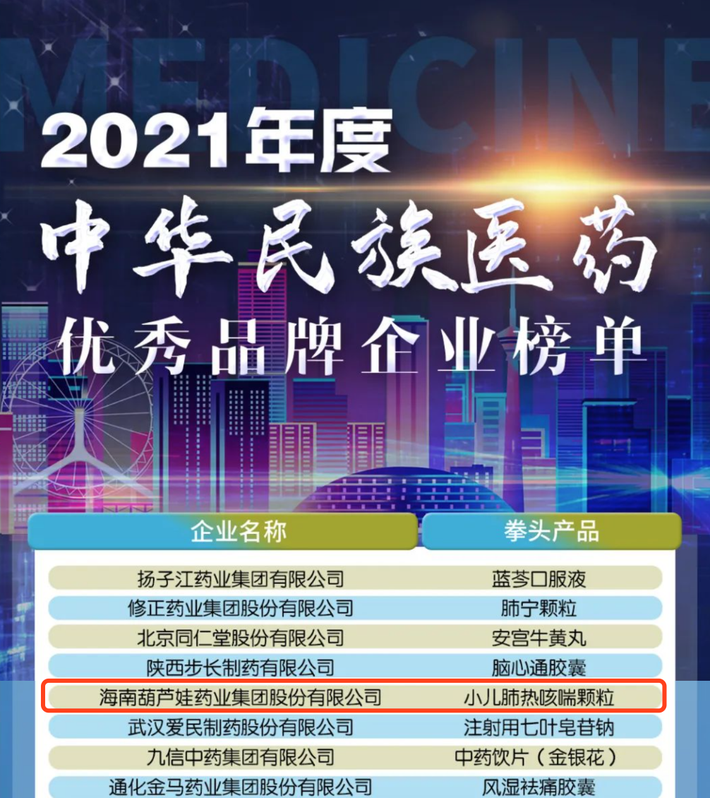 12月29日,全国工商联医药业商会发布了“2021年度中华民族医药优秀品牌企业榜单”,YP街机电子药业集团凭借黄金单品小儿肺热咳喘颗粒(4克)实力登榜。